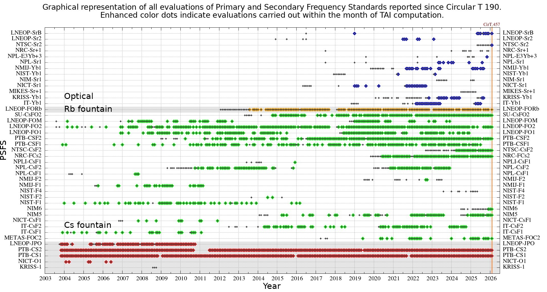 The figure on the BIPM website shows the participation of cesium fountain primary as primary standards, and rubidium fountain clocks and optical clocks as secondary standards, in the monthly calibration of TAI. Dark markers indicate clocks that provided data to BIPM, while bright colored markers indicate clocks that served that month as standards steering TAI. NTSC-Sr2 and NIM-Sr1 are the designations of the strontium optical clocks developed by NTSC and the National Institute of Metrology (NIM) of China, respectively. (Image from BIPM)