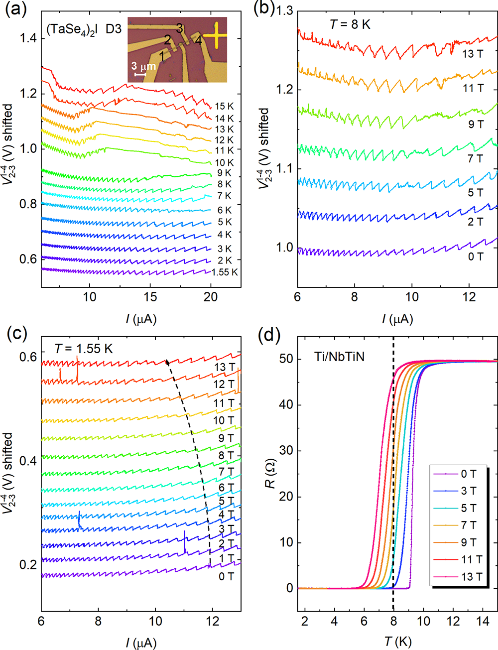 Figure 2.a. Temperature-dependent oscillation in the V-I curves of (TaSe4)2I nanowire device D3, where the oscillation becomes blurred when the temperature exceeds the superconducting transition Tc of NbTiN; b. Magnetic field-dependent oscillation in the V-I curves at 8K, where the oscillation starts to blur as the external magnetic field rises above the upper critical field Hc2 of NbTiN; c. Magnetic field-dependent oscillation in the V-I curves at 1.55K; d. R-T curves of Ti/NbTiN electrodes as a function of magnetic field.