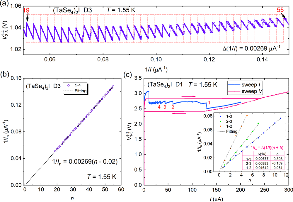 Figure 3.a. Perfect periodicity of V as a function of 1/I in (TaSe4)2I nanowire device D3; b. Linear behavior of 1/In at each oscillation position in the V-I curve of D3 as a function of oscillation index n; c. Observation in device D1 where the oscillation index n reaches 1, followed by the disappearance of oscillation with increasing current.