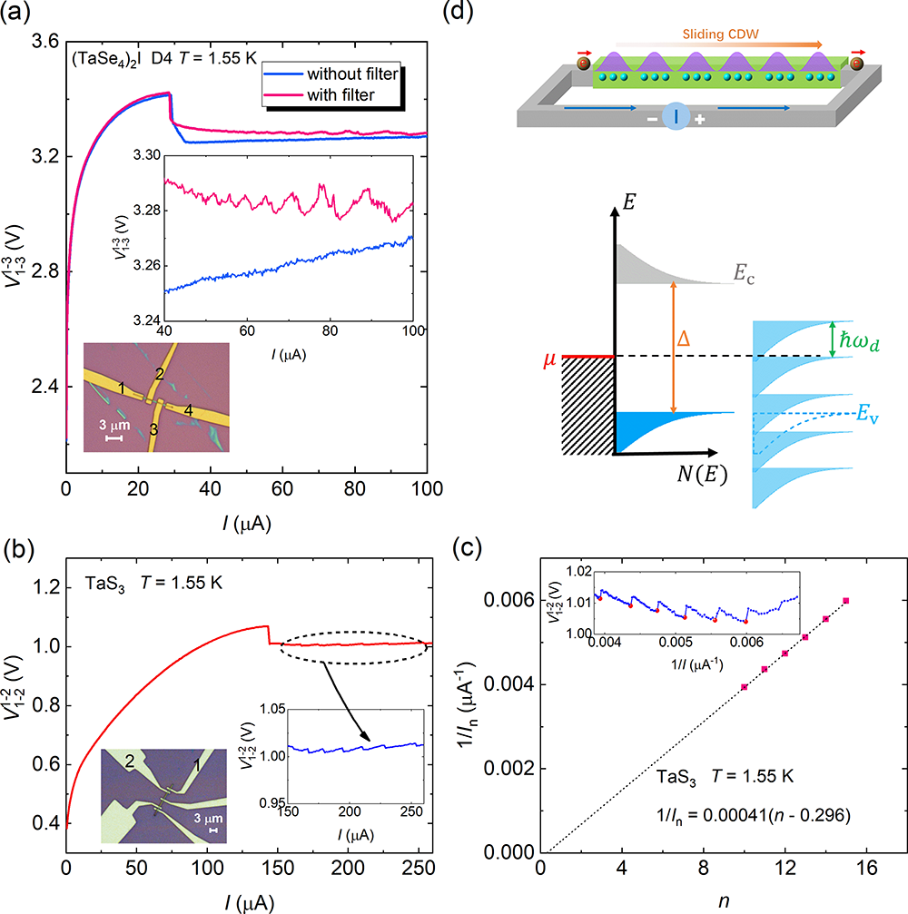 (TaSe4)2I and TaS3 are quasi-one-dimensional charge density wave materials with van der Waals structures. The research team obtained their nanowires using the tape exfoliation method, prepared electrodes using Ti/NbTiN or Ti/Nb materials, and analyzed the changes in their voltage-current (V-I) characteristics with temperature. As the temperature decreased from room temperature through the charge density wave transition temperature TCDW to the system's base temperature of 1.55 K, the V-I curves gradually exhibited nonlinear behavior, and the differential resistance approached zero within a certain current range, indicating the emergence of an ideal Fröhlich conduction state (with the differential conductance tending to infinity). Interestingly, in the Fröhlich conduction region, V exhibited sawtooth-like oscillations with I. When the horizontal axis was converted to 1/I, periodic oscillations were observed (Figures 1, 3, 4), and the oscillation index n could reach 1 (Figure 3). This oscillation phenomenon could be reproduced in different devices and different charge density wave materials. Through measurements on a large number of devices, the research team believed that its appearance required specific conditions, including but not limited to: low dissipation at the electrode-material interface, low electromagnetic noise interference, pure charge density wave current (good insulation before slipping), and temperatures far below TCDW (Figures 2, 4).