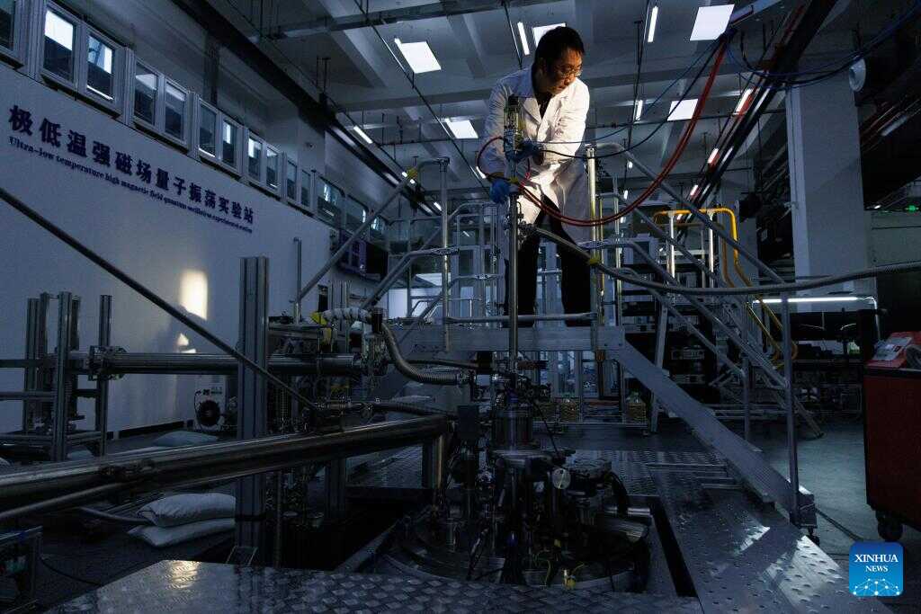 Researcher Li Gang works at the ultra-low temperature high magnetic field quantum oscillation experimental station of the Institute of Physics of the Chinese Academy of Sciences in Beijing, capital of China, on Jan. 26, 2026. (Xinhua/Jin Liwang)