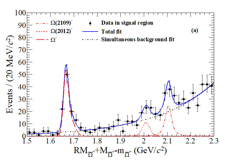 Meanwhile, BESIII also presents evidence for a new production mechanism for the previously identified Ω(2012)- via the process e+ e-→Ω(2012)- Ωbar++c.c. with a significance of 3.5 σ. Figure 1 shows the recoil mass spectrum of Ωbar+/Ω- in the signal region (a) and sideband region (b) in the data, where the red long dashed, red short dashed, and red double-dot-dashed lines are the signal shapes for Ω-, Ω(2012)-, and Ω(2019)-, respectively.