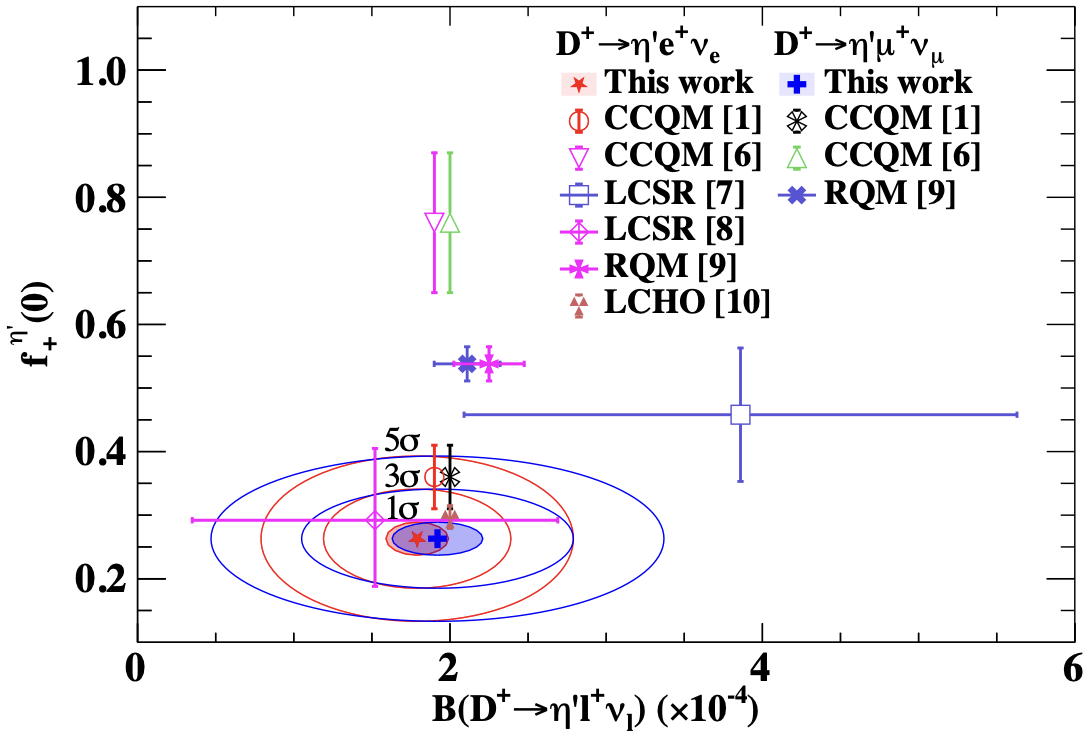 Fig. 1: Comparison of the branching fractions and form factors measured in this work and those given by different theoretical predictions.