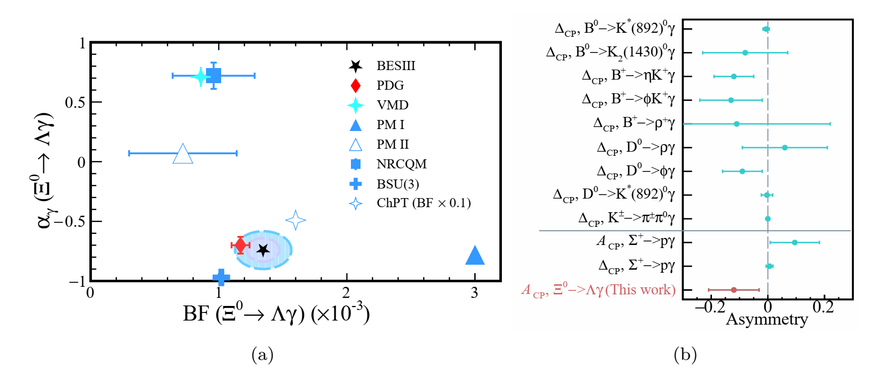 Figure: (a) Comparison of the BESIII measurement of the decay asymmetry parameter and branching fraction for Ξ0→Λγ with various theoretical predictions. (b) Summary of CP asymmetry measurements in weak radiative decays of mesons and baryons.