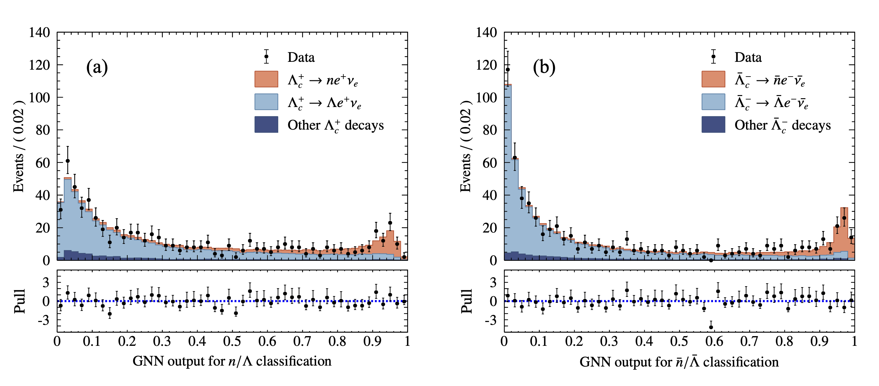 Figure 2. Fits to the GNN output distributions for the signal candidates of (a) Λc+ -> ne+ve and (b) Λbarc- -> nbar e-ve in data.