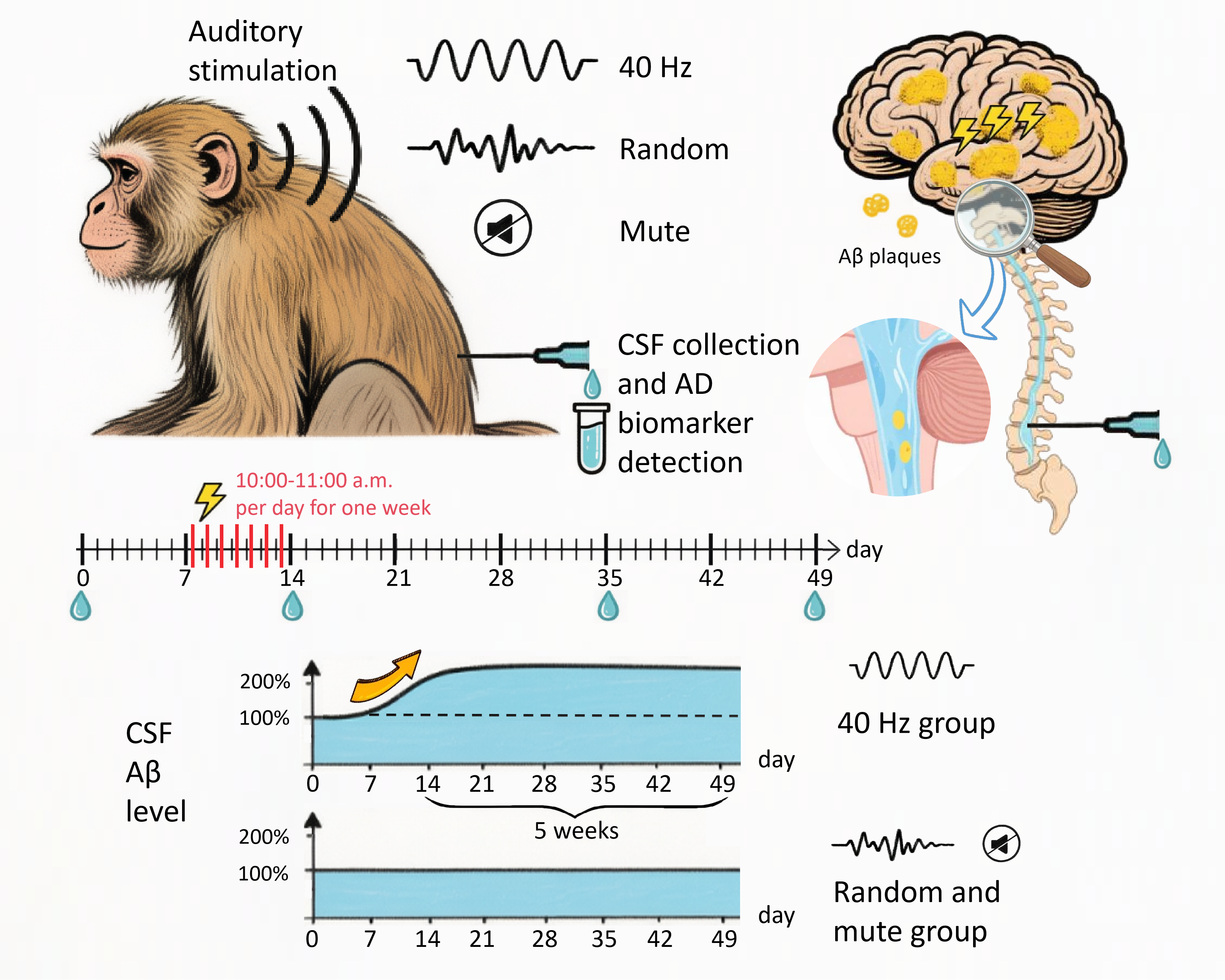 A research team from the Kunming Institute of Zoology (KIZ) of the Chinese Academy of Sciences has demonstrated for the first time in non-human primates that auditory stimulation at 40-Hz significantly elevates β-amyloid levels in the cerebrospinal fluid (CSF) of aged rhesus monkeys, with this effect persisting for over five weeks.