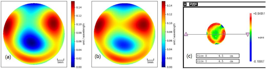 Fig. 2. Micro-defocus experimental results (a) Reconstruction result with 1 mm defocus; (b) Reconstruction result with 2 mm defocus; (c) Measurement result from the ZYGO interferometer.