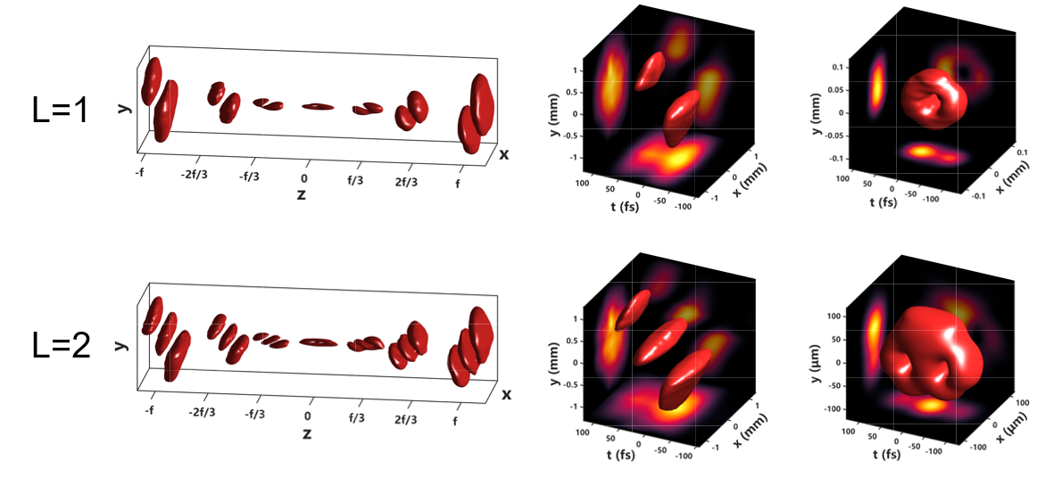 Fig.2. Measured and predicted 3D topological evolution of STOV during focusing with a spatiotemporal topological