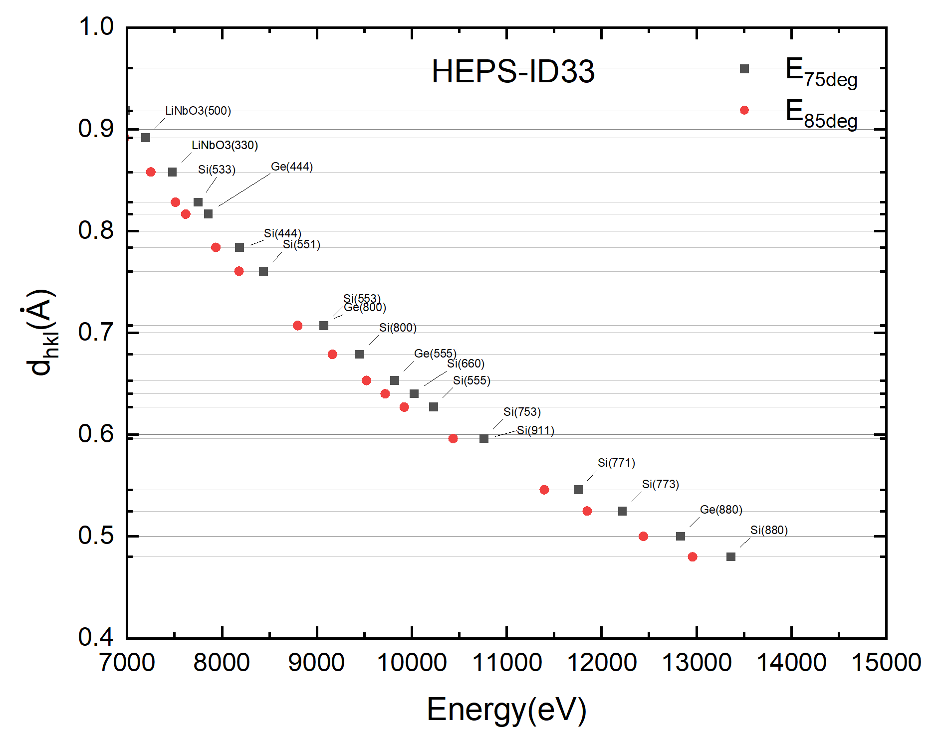 高温加入装置和RT~1000℃温度测试曲线 【探测器Detectors】 Lambda, Minipix, APD, Ionic chamber, PIN diode 【制样设备Sample preparation】 显微镜、手套箱 【数据收集与处理Data Acquisition】数据采集由HEPS开发的mamba软件完成,一方面可实现通用的实验流程控制,主要包括电机运动、探测器参数设置、一维/二维/多轴联动扫描等;另一方面,根据三种主要实验方法,定制了在线数据组装模块,主要包括: NRS:核向前散射与核共振非弹性散射实验结果展示,可自由选择APD探测器通道和积分时间窗口,能量扫描有分段功能。 XRS:对原始二维探测器数据进行ROI设置、积分,扣除弹性散射能量,并叠加得到以能量损失为横轴的谱图 RIXS:实时数据处理,展示散射能谱,结合入射能量扫描,可实时展示RIXS二维图谱 【各部分介绍Description】液氮冷却双晶单色器:Si(111)和Si(311)液氮冷却双晶单色器是高分辨谱学线站最重要的光学设备之一,采用Si(111)和Si(311)两组晶体切换设计。Si(111)的布拉格转角工作范围8.06~32.7,工作能区 7keV~27keV,Si(311)布拉格转角范围17.06~24.9,工作能区9keV~14keV。核共振散射(14.4keV) 和共振非弹性散射(8.9keV)选择Si(111);X射线拉曼散射(9.7keV, 12.9keV)采用Si(311)。其中X射线拉曼散射谱学要求扫描双晶单色器,扫描能量范围在9.7keV附近扫描1keV,或在12.9keV附近扫描1keV。 HEPS-ID33 液氮冷却Si(111)/Si(311)双晶单色器 用于核共振散射实验的meV高分辨单色器高分辨单色器是高分辨谱学线站-核共振散射实验的重要光学部件之一。前级双晶Si(111)单色器的能量分辨可以达10-4。高分辨单色器则需要达到1meV/14.4keV=6.9×10-8量级。采用四晶高分辨单色器设计。高分辨谱学线站目前有两套meV高分辨单色器,第一种配置为嵌套型,即2meV嵌套型高分辨单色器,Si(4,4,0)+ Si(9,7,5), (+n,+m,-m,-n)型,这种配置方式可以实现较高的能量分辨,且无色散,后端KB镜聚焦时可以聚焦到极小的光斑。第二种则为色散型,即1meV色散型高分辨单色器 Si(4,0,0)+ Si(10,6,4), (+n,-n,-m,+m)型,这种配置方式的优势在于可获得极高的能量分辨,但由于色散,会导致后端KB镜垂直聚焦方向光斑扩展。