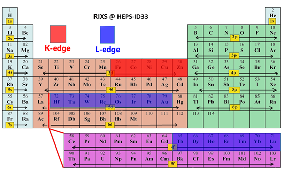 HEPS-ID33 X射线拉曼散射可测量的元素及其对应吸收边 共振非弹性X射线散射共振非弹性X射线散射(RIXS)主要用于探测材料中各类低能的元激发,如声子、磁振子、d-d跃迁、等离激元等。其探测原理是通过探测入射光与散射光之间的能量、动量差异,阐明元激发的物理机制。通过将入射光能量调至特定元素吸收边,可以实现元素选择性。 RIXS可以认为是X射线吸收谱学与X射线发射谱学的结合,通过同时改变入射能量和散射能量,可以测量二维的RIXS图谱,得到关于电子结构和各类元激发的更精细信息。 要利用RIXS探测不同类型的元激发,需要的能量与动量分辨能力有所不同。RIXS能量分辨率最好可以达到约10meV量级,这一量级的能量分辨主要用于探测声子、磁振子等低能激发。然而,提高能量分辨的代价是牺牲探测效率,如d-d跃迁等能量较高的激发则不需要超高的能量分辨,此时,可以采用低分辨/高效率模式,能量分辨约几百meV量级。根据探测的元激发类型,有的元激发有动量依赖特性,需要动量分辨的RIXS测量,而有些元激发则几乎没有色散,不需要动量分辨能力。 RIXS实验可以在软X射线至硬X射线的较宽波段开展,其中硬X射线RIXS主要关注的吸收边是3d过渡金属的K边、4f稀土元素和5d过渡金属的L边。硬X射线RIXS是块体敏感的,一般探测深度可达μm级别,适合施加各类复杂的样品环境,如高压、高低温、外场等。