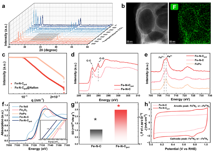 研究团队首先通过理论计算,预测了能够容纳Nafion聚集体的大孔以及更亲水的催化剂表面可以协同促进连续的质子传输网络的构建,同时更均匀的离聚物分布也显著降低了阴极催化层的氧气传输阻力。然后利用高温熔融盐刻蚀法制备了具有上述特征的亲水多孔碳材料,以验证分子动力学模拟结果的可靠性。团队运用了多种谱学技术联用方法对材料结构和催化过程进行深入分析。原位X射线衍射分析揭示了热解中温度依赖的多孔结构形成过程;同步辐射超小角X射线散射证实了大孔在诱导催化层中离聚物分布中的重要作用;软X射线吸收谱证明了碳材料中C-O官能团的增加,为材料亲水性的增强提供依据;X射线精细吸收结构和X射线发射谱共同确立了两种催化剂中Fe的N配位单原子存在形式,说明器件层面的活性大幅提升并不主要源于位点构型的改变,而是优化的阴极催化层传质通道的建立;原位红外光谱揭示了改性后铁氮碳中氢键网络的增强和界面水结构的变化(阻碍质子传输的孤立水比例显著减少),为模拟预测的质子传输促进过程提供又一直接光谱证据。