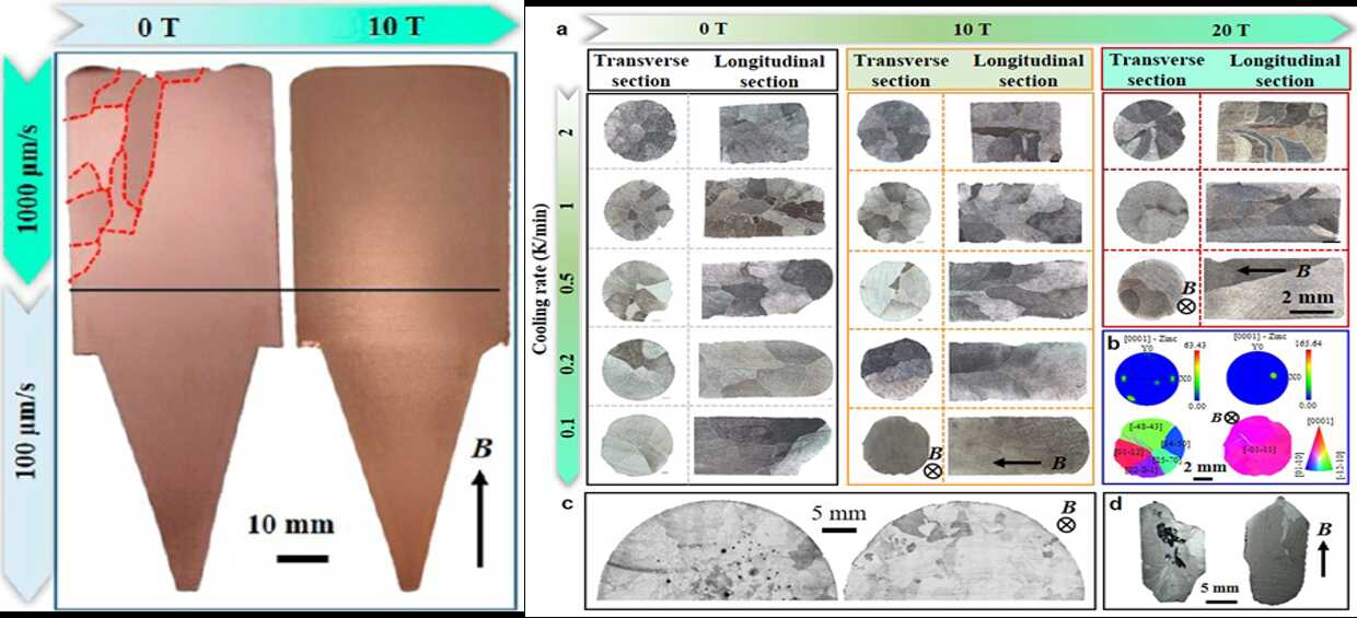 图2. 左图:有无强磁场下获得纯铜晶体;右图:不同磁感应强度与冷却速度条件下获得的纯锌、纯锗晶体