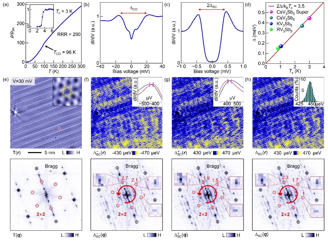 此外,科研团队还利用非磁性掺杂样品Cs(V0.93Nb0.07)3Nb5进行了对比实验。结果表明,在掺杂样品中,2×2 CDW信号依然清晰可辨(图3e,f),超导能隙甚至出现增强(图3g);但在配对能隙空间分布的傅里叶分析中,2×2配对调制信号完全消失(图3i)。这一结果表明PDW受到了非磁性杂质散射的破坏,为其具有相位反转特征(图3a)提供了有力实验证据。