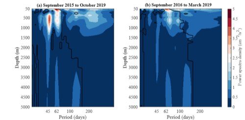 研究结果表明,菲律宾海经向流速存在两个主要的季节内变化周期分别是45天和62天,具体表现为:250–5000米的整层海流都具有显著的45天的变化,在1500米以上和2500米以下海流中可见62天的变化信号。进一步研究发现,近乎于全水深存在的45天变化和深层海洋的62天变化主要是由海盆正压罗斯贝波本征模调制,其能量来源于局地共振风场,1500米以上的62天的季节内变化受大洋第一斜压Rossby波的控制。