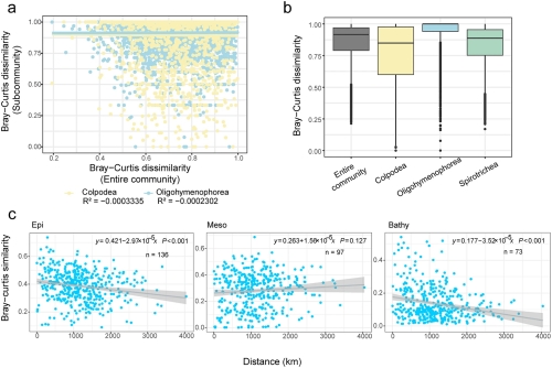 图2 纤毛虫群异质性以及距离-衰减分布格局