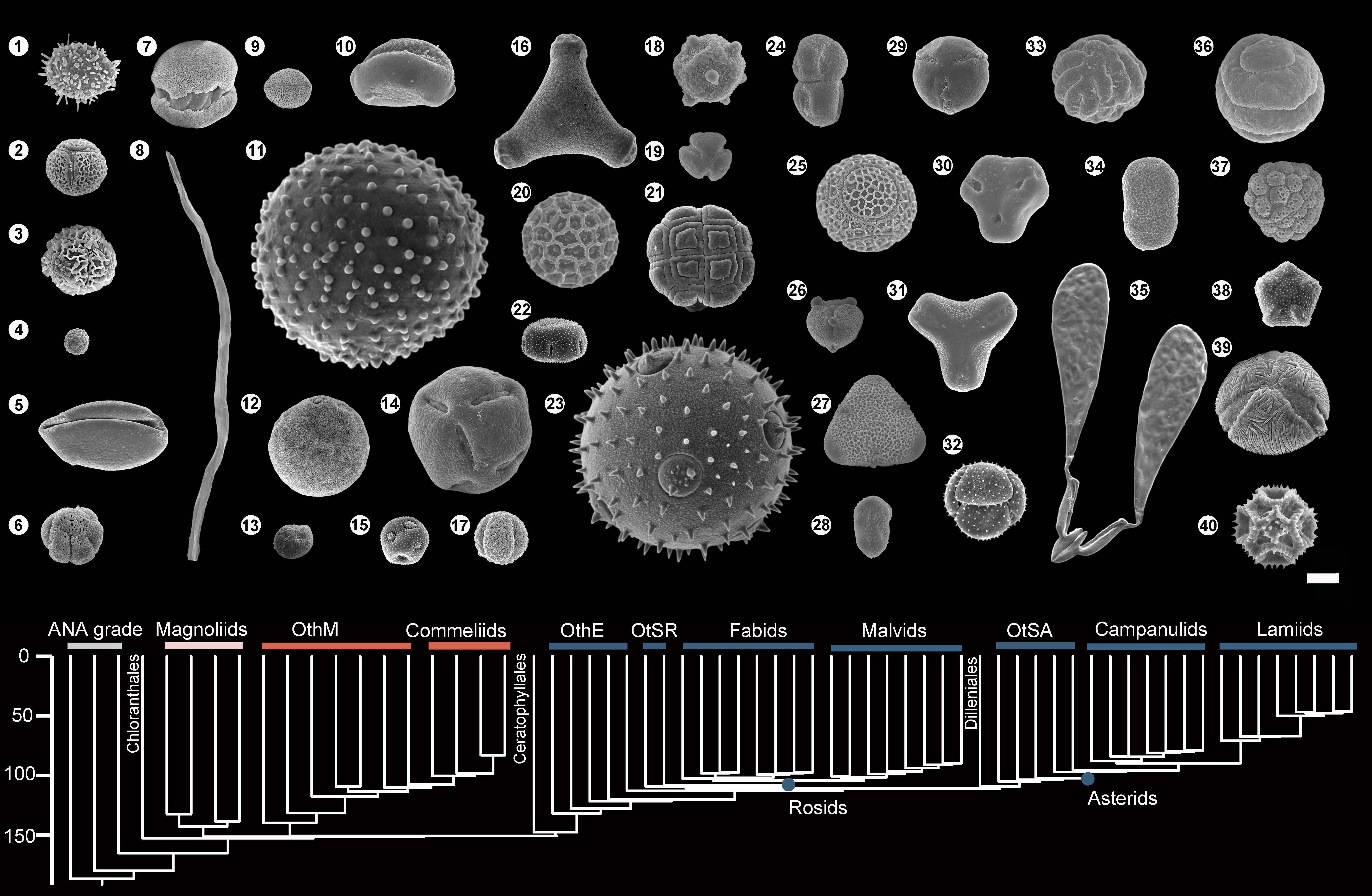 被子植物(有花植物)花粉形态复杂多样,是植物分类与系统演化研究以及古植物与古生态学研究的重要依据。近日,中国科学院昆明植物研究所中国西南野生生物种质资源库联合国内外多家科研机构,通过编码被子植物APG IV系统现存64目434科1880属的花粉特征数据,结合来自三套基因组12个基因片段的属级水平时间校准的分子系统发育树,定量研究了花粉形态多样性(pollen disparity)的演化历程,揭示了其脉冲式演化模式,为理解被子植...