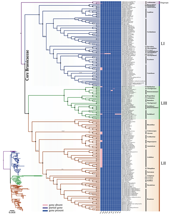 中国科学院昆明植物研究所植物多样性与基因组学团队李德铢研究组依托中国西南野生生物种质资源库,选取核心十字花科31族71属199种以及4个未划分至族的属进行全面分析,以该科基部类群岩芥菜族中的三个代表种为外类群,共囊括222个叶绿体基因组数据以及235个核糖体(nr)DNA(其中106个叶绿体基因组数据以及112个nrDNA数据为该研究中新获取)。在基于nrDNA序列进行的系统发育分析中,将核心十字花科划分为4个分支,即clades a–d(图1)。该研究还基于叶绿体全基因组数据以及蛋白编码基因构建了两种矩阵,移除比对存疑的区域或去除替换饱和的基因后,利用贝叶斯法以及最大似然法重建了核心十字花科的系统发育关系。研究结果支持将核心十字花科划分为三个高支持率的分支:Lineage Ⅰ(LI),Lineage II(LII)和Lineage Ⅲ(LⅢ),其中LⅠ与LⅡ + LⅢ构成姐妹群(图2和3)。该研究将备受争议的LⅡ分支解析为单系分支,阐明了一些难以解析的深度分支的系统发育关系,确定双盾荠族为该分支最早分化的类群,岩荠族与高河菜族+含生荠族互为姐妹类群(图3)。LⅢ分支与基于nrDNA序列研究划分的clade d分支表现出高度的一致性,两组数据集的分析结果都支持离子芥族、花旗杆族以及鸟头荠族为并系类群。此外,该研究综合比较核质之间的系统发育关系,还发现了大量的冲突节点,进一步证实了十字花科经历了复杂的进化历史,为十字花科的起源与进化历史提供了研究基础。另一方面,该研究还发现叶绿体编码基因rps16的丢失可能是南芥族和庭芥族的共衍征(图2)。