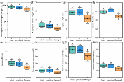 图2 昆虫损伤水平对长穗高山栎幼苗定居百分比(a)和幼苗生长(b-h)的影响。