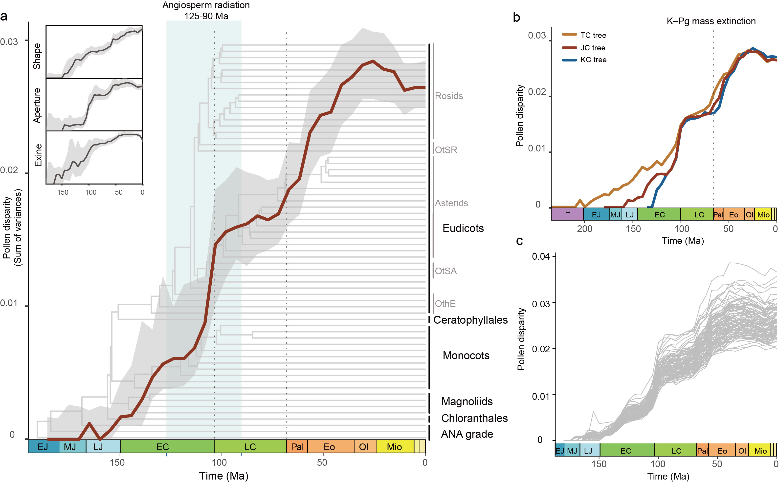 图3 随时间变化的被子植物花粉形态多样性(disparity through time, DTT):a) 基于nmds排序;b) 基于被子植物冠群不同起源时间假说;c) 基于100次随机子采样(n=1000)