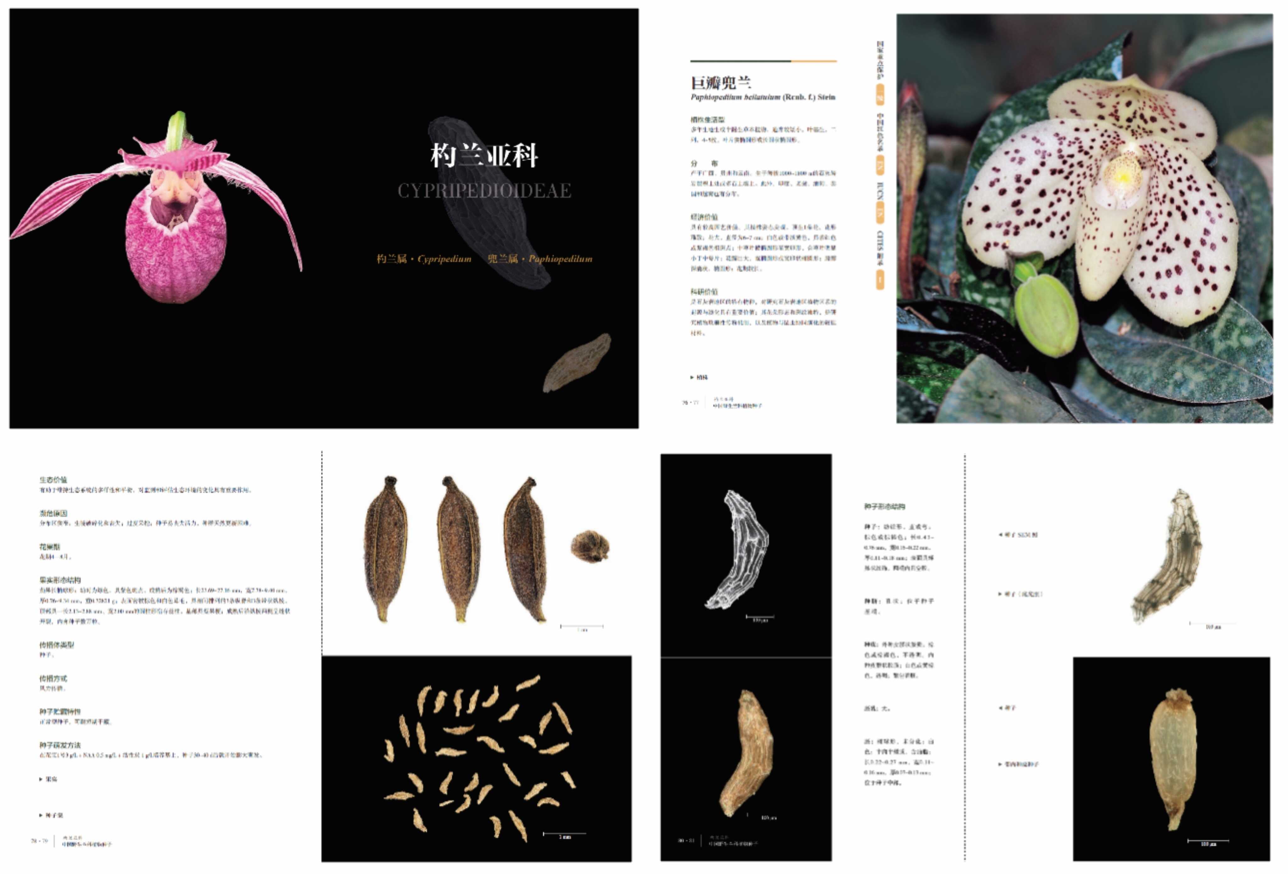 依托我国重大科技基础设施——中国西南野生生物种质资源库,作者选取了在经济、科研、生态和文化方面具有重要价值,而种群稀少、濒危程度较高的5亚科14族59属127种中国野生兰科植物种子作为研究对象,历时6年进行系统研究,编撰完成了《中国野生兰科植物种子》一书。该书共784页63万字,系统而翔实地记录了这些物种种子的外部形态、内部结构、传播方式、贮藏特性和萌发特性,同时介绍了其果实形态,以及物种的生活型、地理分布、经济价值、科研价值、濒危等级和致危因素,内容丰富而新颖,兼具学术性和实用性。同时全书配有1000多张高清大幅照片,内容涉及植株、花、果序、果实和种子,类型包括光学照片、光学显微照片和扫描电镜照片。其中种子照片不仅包括了群体照和单照,还有难得一见的带内种皮种子照片及胚照片,大多数为首次发表。这些照片通过精美的排版方式,与文字相互交融,使该书兼具科学性和艺术性。