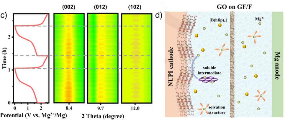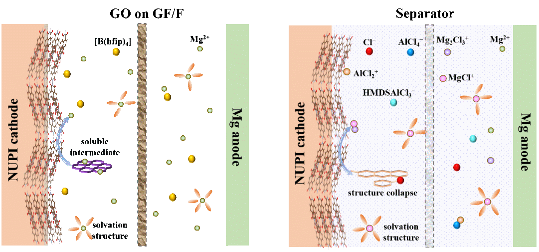 近日,上海交通大学邹建新团队、比利时鲁汶大学Alexandru Vlad/林晓东团队设计了两个具有相似主链但π共轭程度不同的聚酰亚胺NUPI与PUPI,并系统研究了它们在含氯/无氯电解质中的电化学性能。结果表明:含氯电解质因其电化学稳定窗口窄、物种反应性强,会限制PI骨架的烯醇化程度与可逆性,从而限制容量;无氯电解质具有更宽电化学窗口与更温和的界面化学,可实现更深程度及更可逆的烯醇化,从而实现更高的可逆容量。此外,PI分子结构也起关键作用:相比π–π堆积较弱、微结构更无序的PUPI,NUPI能形成均匀的层状结构与更强π–π相互作用,有利于跨层电荷传输与Mg2+插入/脱出,因而表现出更优的储镁性能。此外,通过氧化石墨烯修饰隔膜进一步抑制了有机物种的溶解穿梭效应。原位/非原位表征与DFT计算揭示了烯醇化反应为核心的可逆快速储镁机制。综上,本研究阐明了PI分子结构与电解质化学在调控Mg2+传输与界面稳定性方面的协同作用,并建立了一种可推广的高性能镁金属电池协同设计策略。