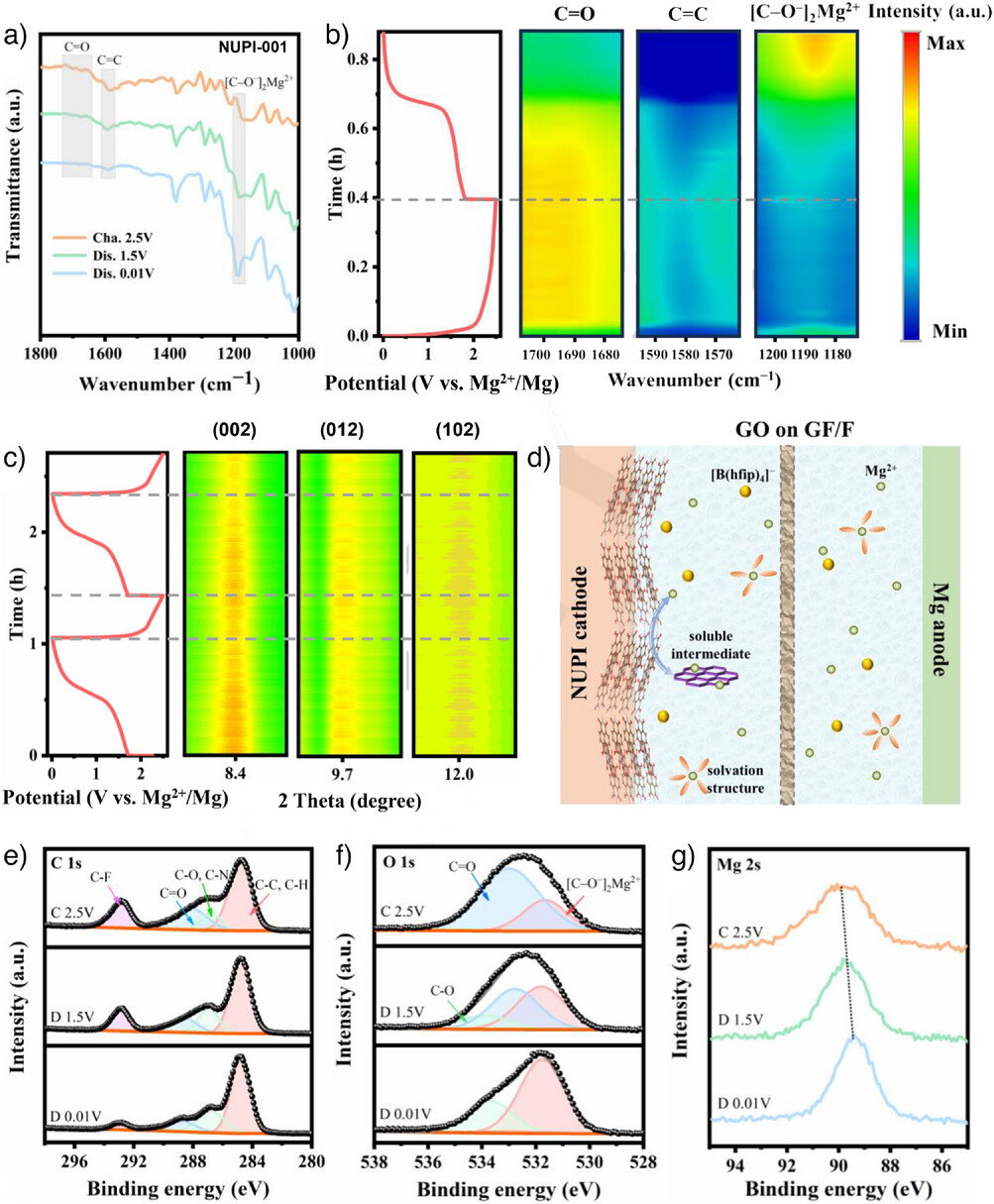 为阐明Mg2+储存机理,利用原位与非原位光谱测试。C=O在放电过程中逐渐减弱并最终消失,同时出现~1190 cm–1的[C–O–]2Mg2+伸缩新峰;充电后C=O恢复、[C–O–]2Mg2+减弱。NUPI于0.01 V下的[C–O–]2Mg2+信号更强,说明更深的放电使更多活性位点参与可逆烯醇化,而较窄电压窗口的电解液将不可避免地限制此过程。同步辐射原位FTIR进一步确认了其可逆性。如图2b 所示,在放电过程中,[C─O−]2Mg2+伸缩振动峰(约1190 cm−1)增强,而C═O(1680–1700 cm−1)和 C═C(约 1580 cm−1)伸缩振动峰的强度降低,这些变化在充电时会发生逆转。