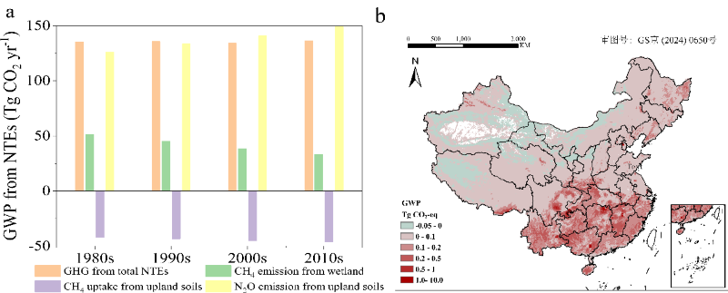 中国自然陆地生态系统长期受到人类活动的深刻影响,如湿地垦殖、植树造林和草地退化等,这些过程显著改变了甲烷(CH₄)与氧化亚氮(N₂O)的源汇格局,也增加了科学评估的不确定性。然而,现有研究多集中于单一气体或单一生态系统,且方法上往往依赖单一途径,难以全面揭示中国非 CO₂温室气体的整体收支与综合变暖效应(GWP)。