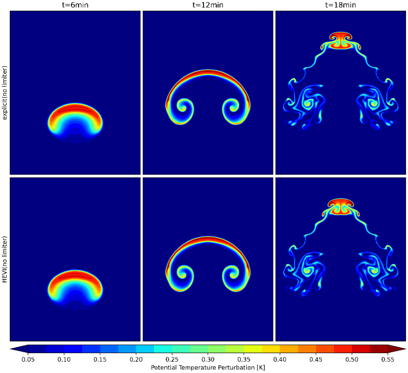 图2:Robert连续热泡实验。上方为显式方案结果,下方为使用垂直隐式求解器的结果,第1~3列为不同时刻的模拟结果。