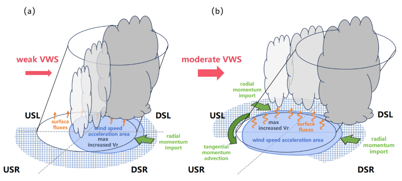 图1 (左)弱、(右)中等垂直风切变环境下涡旋对流与结构演变差异示意图
