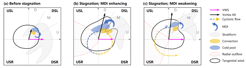 针对垂直风切变环境的数值模拟试验表明,在强切变下涡旋向顺风切左侧倾斜并维持,对流在该象限聚集增强(图2a)。对流活动下游的层云降水蒸发冷却引起中层下沉入流(MDI)增强(图2b)。MDI通过增强低层径向入流,使得顺风切左侧象限下风区的局地风场显著增强。但这一过程同时引起顺风切左侧象限低层风场呈现显著的非对称性,导致该象限切向风方位平流对风场增强的作用为显著的负贡献,进而使方位平均的尺度扩张出现“停滞”现象。随后,涡旋倾斜长时间维持又通过边界层热动力过程削弱顺风切侧对流区的上升气流,导致顺风切左侧对流、层云降水及 MDI减弱(图2c)。最终,切向风的局地非对称性减弱,方位平均尺度的扩张也随之恢复。