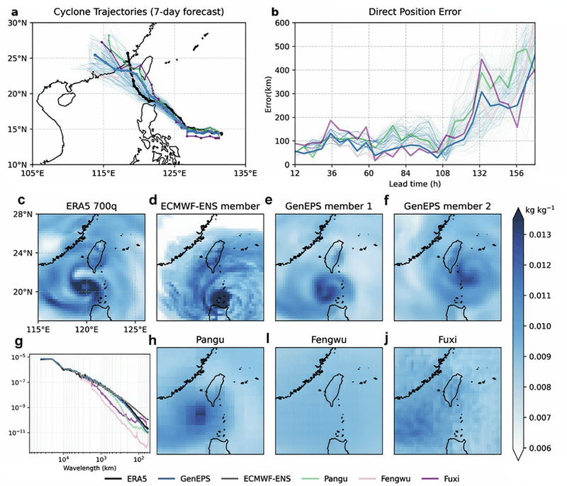 图2:台风“杜苏芮”7天预报(2023年7月21日00UTC初始)。 (c-f)700 hPa比湿场,包括ERA5验证、ECMWF-ENS成员和GenEPS成员;(g)功率谱分析;(h-j)Pangu、Fengwu和Fuxi的确定性预报场。