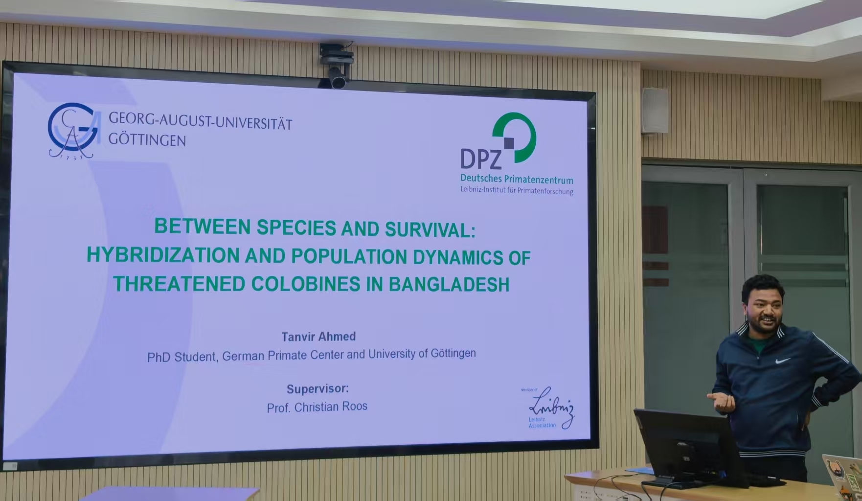 Ahmed博士以“物种界限与生存之道:孟加拉国珍稀濒危疣猴的杂交与种群动态研究”为题,系统介绍了其在孟加拉国27个森林地点开展的种群调查与非侵入性遗传学研究。他展示了如何利用分子遗传学手段揭示濒危菲氏叶猴与冠叶猴间的基因渗透现象,并探讨了杂交在破碎化生境中对灵长类保护的双重意义。报告还回顾了他参与发现灵长类新种——波巴叶猴的研究历程。