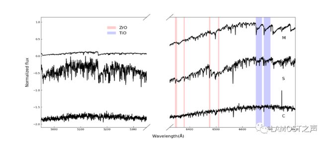 图1 从上到下依次是M型星、S型星和碳星的LAMOST中分辨率光谱