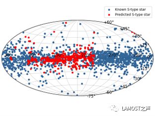 图2:S型恒星的空间分布,蓝色点为已发现的S型恒星,红色点为该工作中发现的S型星