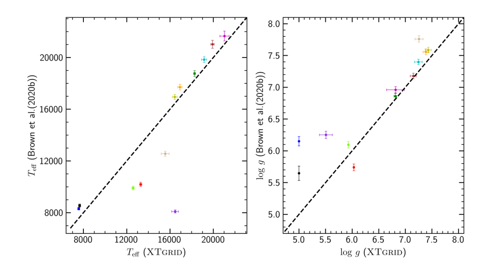图2:12颗已经证认的极低质量白矮星的大气参数(有效温度和重力加速度)。横坐标表示的是LAMOST低分辨率光谱拟合结果,纵坐标展示的是极低质量白矮星巡天项目中的大气参数(ELM Survey, Brown et al. 2020, ApJ,889,49)。