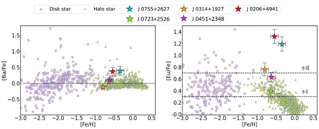 此次发现的这两颗恒星不仅位于银河系盘内,还表现出较高的金属丰度([Fe/H]分别为-0.34和-0.80),其中J0755+2627更是目前已知金属丰度最高的r-过程元素高度增丰恒星(r-II星,[Eu/Fe] > +0.7)。这一发现挑战了r-过程元素增丰恒星(RPE星)大多数是贫金属且位于银晕中的传统认知,为r-过程的研究提供了新视角。