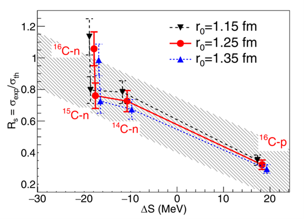 HIRFL-CSR上的放射性束流线RIBLL2,是国际上极少数几台可以提供中高能放射性束流的装置之一。研究人员利用RIBLL2提供的240 MeV/u的丰中子束流14-16C轰击碳靶,通过大接收度磁谱仪ETF系统地测量了14-16C单质子、单中子及双中子敲除产物,精确提取了相关反应道的截面,并结合模型计算开展了理论分析。