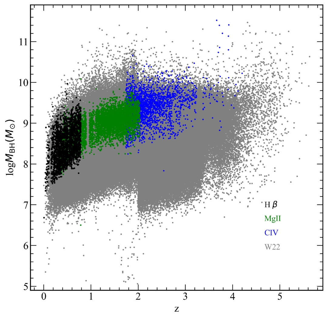 图2:LAMOST类星体的红移和黑洞质量分布及其与美国SDSS DR16类星体(灰色)的比较。黑色、绿色和蓝色分别代表利用氢(Hβ)、镁(Mg II)和碳(C IV)宽发射线测得的LAMOST类星体黑洞质量。
