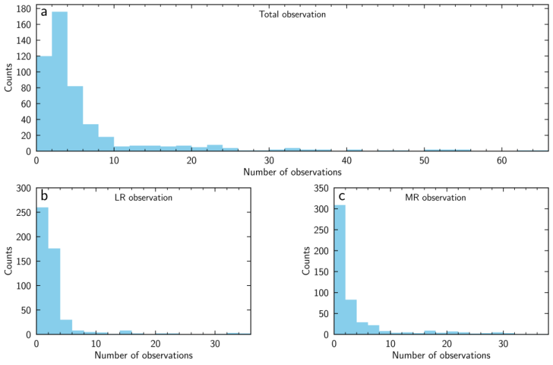 图2:(a) LAMOST对504颗经典Be星的总观测次数分布;(b) LAMOST低分辨率巡天对这些经典Be星的总观测次数分布;(c) LAMOST中分辨率巡天对这些经典Be星的总观测次数分布。