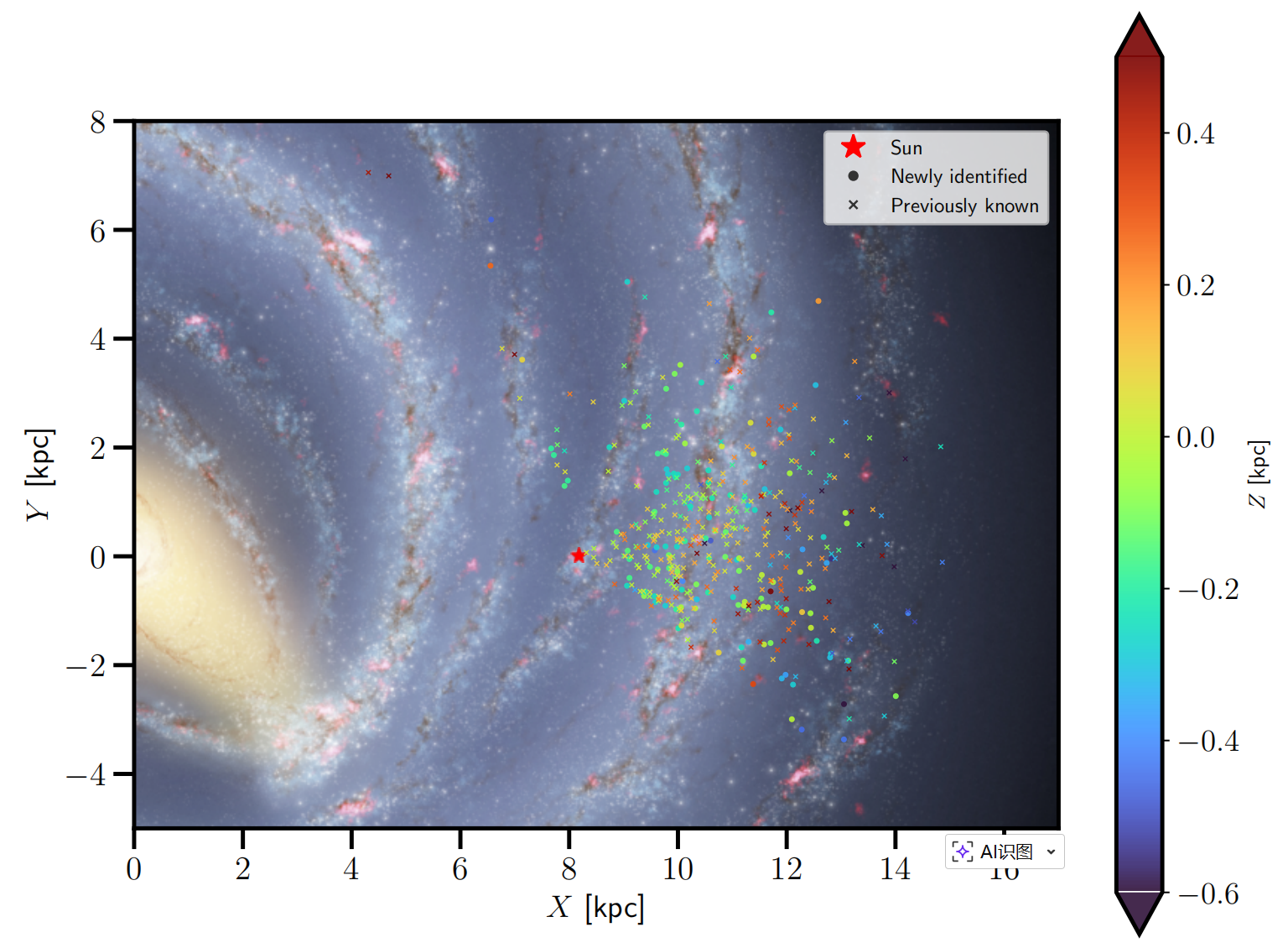 图3:经典Be星的空间分布。新发现的经典Be星以圆圈标记,已知的经典Be星则以叉号标记。经典Be星在银河平面以上的高度通过相应标记的颜色表示。红色五角星标记太阳。
