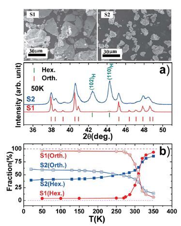 图(a)温度50K时MnNi0.8Fe0.2Ge的X射线衍射谱;图(b)由变温X射线衍射谱得到的六角相和正交相比例随温度变化的依赖关系(S1为晶粒尺寸20~40μm的样品,S2为晶粒尺寸5~15μm的样品)