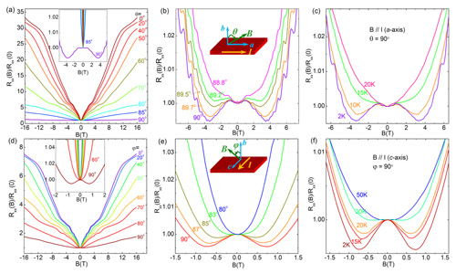 图. 在低温下,当电流与磁场平行时,出现负磁阻行为。而磁场偏离电流方向时,或者温度升高时负磁阻行为消失