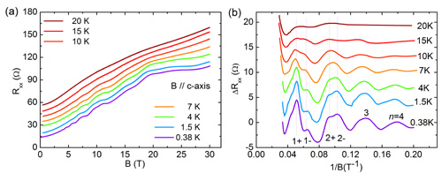 图. 强磁场下的量子输运测试表明,由于电子的朗道能级劈裂,量子振荡峰分裂为两个峰