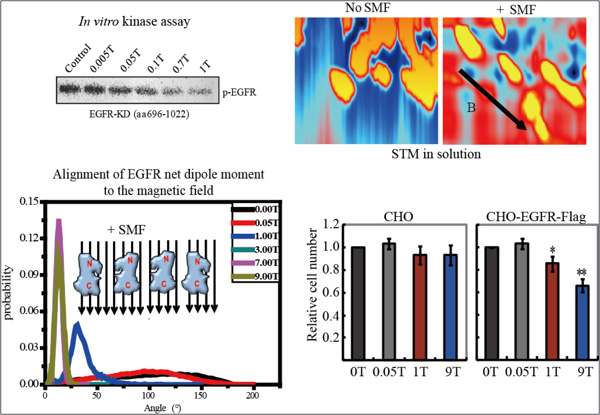 近年来的一些实验证据表明稳态磁场能够抑制一些肿瘤细胞的生长,然而,目前此领域的研究缺乏系统性和深入性,导致磁场对肿瘤细胞的生物学效应并不明确,机制并不清楚。此研究组通过比较不同类型的细胞在不同强度稳态磁场下的生长增殖响应,发现大多数高表达表皮生长因子受体(EGFR)的肿瘤细胞生长受到抑制,进一步体外实验研究表明EGFR纯化蛋白的活性能够直接被稳态磁场所抑制。溶液扫描隧道显微镜单分子成像和理论计算模拟显示,中高强度的稳态磁场能够改变EGFR 蛋白的排列方向,影响其二聚体之间的不对称结合,从而对其激活产生抑制效应。另外,通过比较不同EGFR表达量的细胞,发现稳态磁场可以抑制EGFR高表达的结肠癌细胞和鼻咽癌细胞、以及转染了人源EGFR的中国仓鼠卵巢细胞(CHO,非肿瘤),但是对于CHO细胞本身、以及转染了失活人源EGFR的CHO细胞并没有明显的抑制效果。因此,EGFR是肿瘤细胞增殖受稳态磁场抑制的重要因素之一。