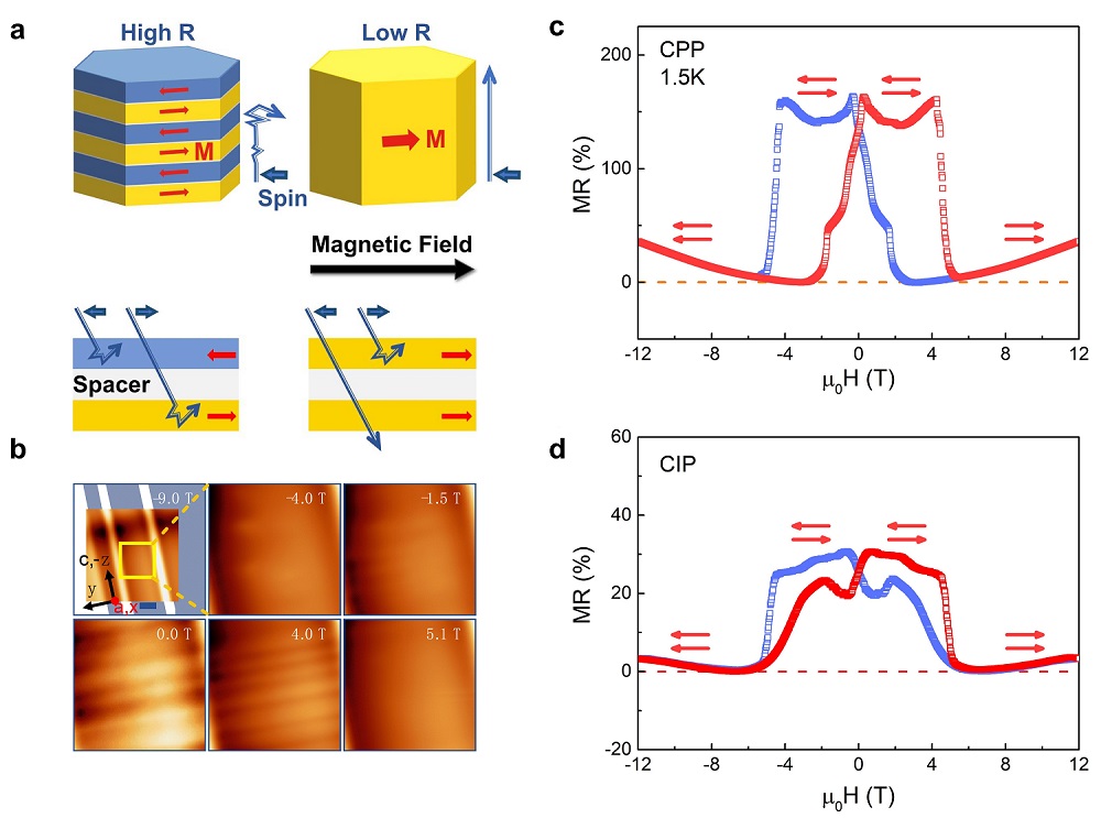 图. (a)基于笼目螺旋磁体的自旋阀效应示意图;(b)笼目螺旋磁体TmMn6Sn6在磁场下MFM成像;(c)电流平行于样品螺磁轴时的非对称磁阻,巨磁阻效应的幅值可达160%以上;(d)电流垂直螺磁轴时的非对称磁阻