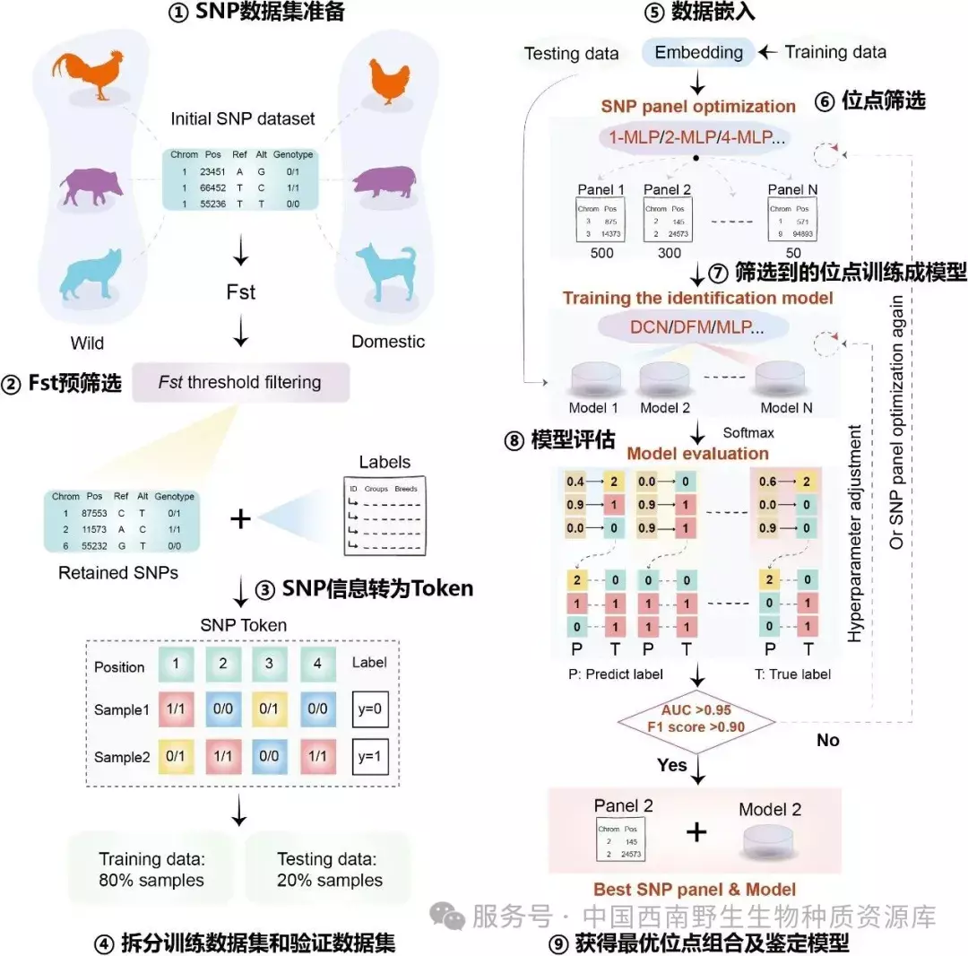 中国西南野生生物种质资源库动物种质库研究团队长期开展家养动物野生近缘种遗传资源多样性研究工作。前期的系列研究工作表明红原鸡(Gallus gallus)是现代家鸡的直系野生祖先,二者遗传背景高度相似,且在驯化后持续发生基因交流,导致家鸡遗传成分不断渗入野生种群,遗传边界愈加模糊。这使得鉴定家鸡与红原鸡成为家养动物-野生近缘种杂交体系中最具代表性、也最具挑战性的案例之一。鉴于传统形态学与分子遗传学鉴定方法均难以有效区分,中国科学院昆明动物研究所联合泰国农业大学(Kasetsart University)等国内外研究团队,创新开发了一套用于区分野生近缘种与家养动物以及杂交个体的人工智能(深度学习)分析流程(图1)。在红原鸡与家鸡体系中,研究团队整合了1,960个样本(含164份红原鸡和1,796份家鸡)基因组数据,构建了基于285个SNP的识别模型,实现对红原鸡、家鸡以及杂交个体的高效准确识别(图2)。在针对博物馆保存的历史标本基因组数据的测试中,即便存在基因型缺失,该模型识别准确率仍达97.8%,体现了在低通量测序甚至古代DNA测序数据分析中保持了良好的鲁棒性。研究团队将该流程拓展至野猪与家猪杂交体系,表现出较强的通用性与推广价值。