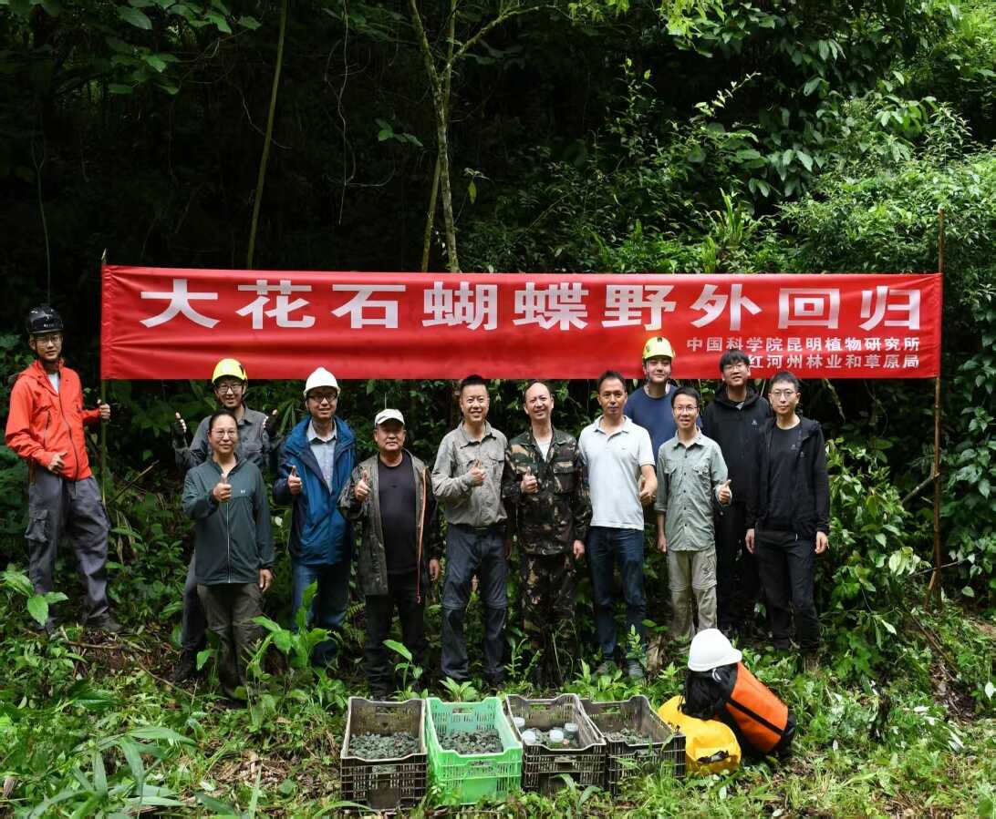 近日,在蒙自市幽深的天坑群中,中国科学院昆明植物研究所(下称:昆明植物所)与红河州林业和草原局,联手开启了一次意义非凡的“回家”之旅,主角是消失了上百年的极危物种——大花石蝴蝶(Petrocosmea grandiflora)。回归现场照(种质资源库供图)2021年,中国西南野生生物种质资源库(以下简称“种质资源库”)在高山科学促进中心的支持下,联合红河州林业和草原局对蒙自市周边的多个天坑进行了初步调查,并于2021年6月17...