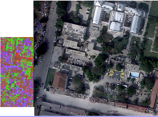 根据Googleearth 21日发布的高分辨率影像,对倒塌房屋图像进行了跟踪验证,结果表明,对地观测中心处理的图像中,倒塌房屋面积提取精度超过85%,误差主要原因是高分辨率影像中建筑物尺度不同,难以用同一种纹理模板刻画,Geoeye的可见光影像中绿色屋顶与绿色植被均表现为绿色所致。采用传统的目视传统解释地震遥感图像的方法,需要地震前后两幅图像的比对才能得出解释结果,速度慢应急应用中难以体现时效性。在抗击汶川地震中对地观测中心自主开发了一种自动快速提取的算法模型,使用这个算法模型只需要地震发生后的一幅高分辨率彩色遥感影像就可以自动快速识别倒塌房屋。只用了3分钟就完成了太子港Geoeye影像倒塌房屋信息图的制作。