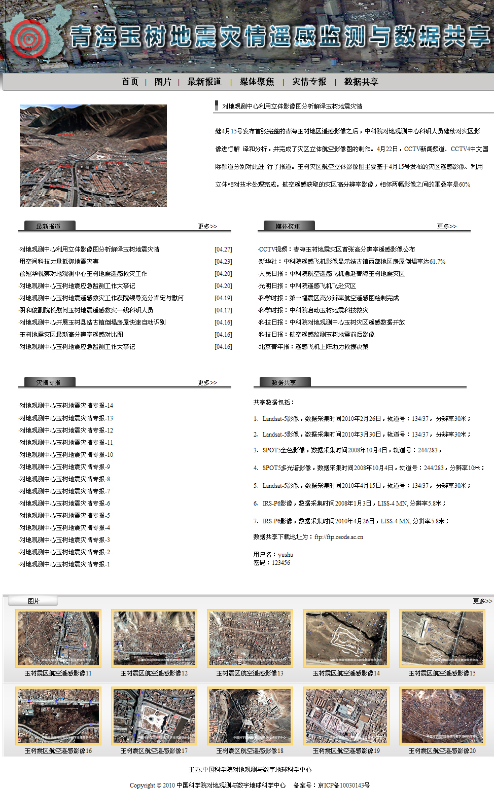 北京时间2010年4月14日7时49分,青海省玉树藏族自治州玉树县发生7.1级地震。危急关头,中科院对地观测与数字地球科学中心(以下简称对地观测中心)第一时间紧急启动遥感应急响应机制,投身抗震救灾工作。地震发生后,对地观测中心在充分发挥遥感飞机传感器高分辨率快速监测作用的同时,利用遥感卫星地面站数据存档、获取及处理方面的优势,紧急处理了一批玉树县地区灾前卫星影像产品,在地震发生当天通过网络提供数据共享服务,...