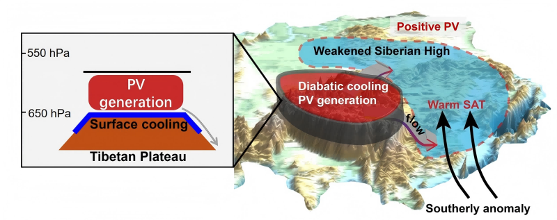 位涡(PV)是理解大气运动的重要理论工具。根据PV理论,地表的热力异常是制造PV,驱动大气环流异常的源动力。青藏高原是全球气候重要的地形强迫,长久以来,人们对青藏高原冬季气候影响的认知,主要集中在其对西风气流的阻挡作用上。那么,冬季高原的热力异常是否能够参与区域气候调控?高原地表的非绝热冷却异常通过什么样的大气过程影响周围区域气候?近日,中国科学院大气物理研究所生宸副研究员、吴国雄院士、刘屹岷研究员...